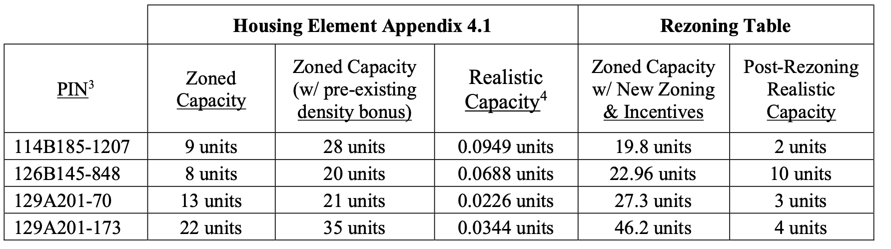 On one site (PIN 126B145-848), the City's new zoning supposedly increased the maximum zoned capacity (with pre-existing state density bonuses) by about 15% (from 20 to 22.96 units). Yet, the City claims the realistic capacity on that site somehow skyrocketed by around 14,500% (from 0.0688 units to 10 units).